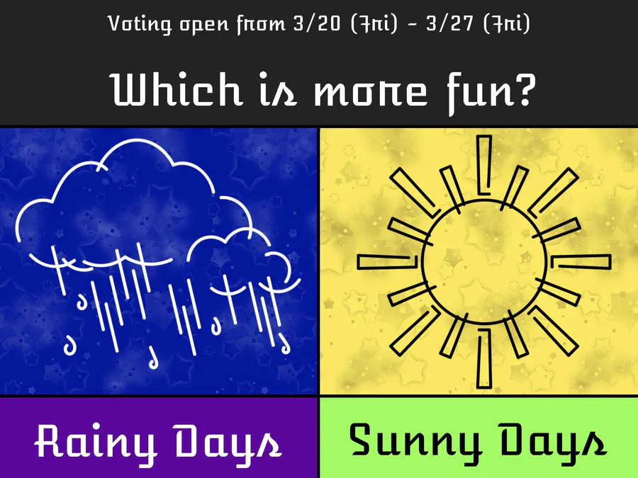 Spring has sprung--this calls for a Celeste Fest! Which is more fun: Rainy Days, or Sunny Days? Cast your vote below, you have until next Sunday to do so!