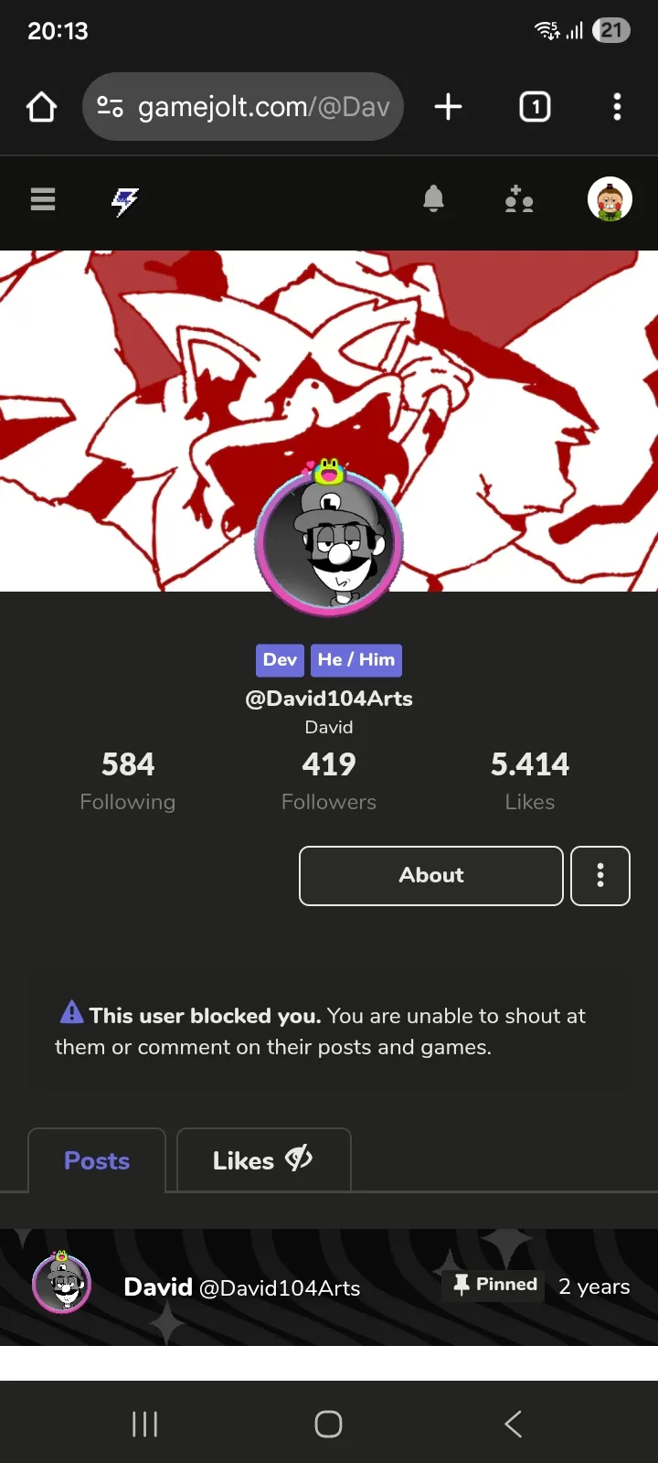 So i was looking into EN devs and i solved to search for their names on gamejolt,and i found david,but he blocked me,i don't know why