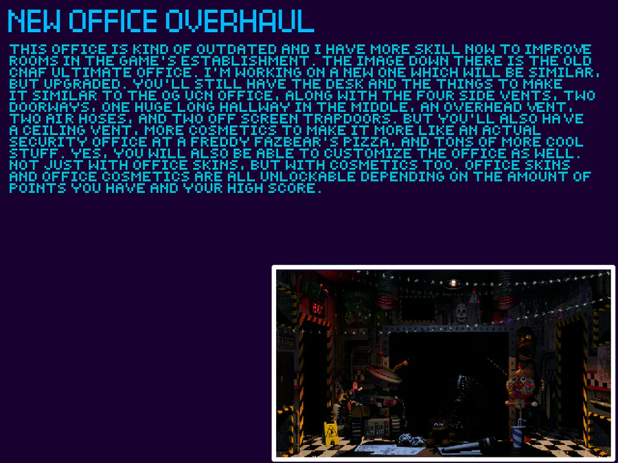 So uh, I’m making a ucn game where you switch to different fnaf offices to deal with some characters, you what do guys think? Also if you have ideas type them in the comments