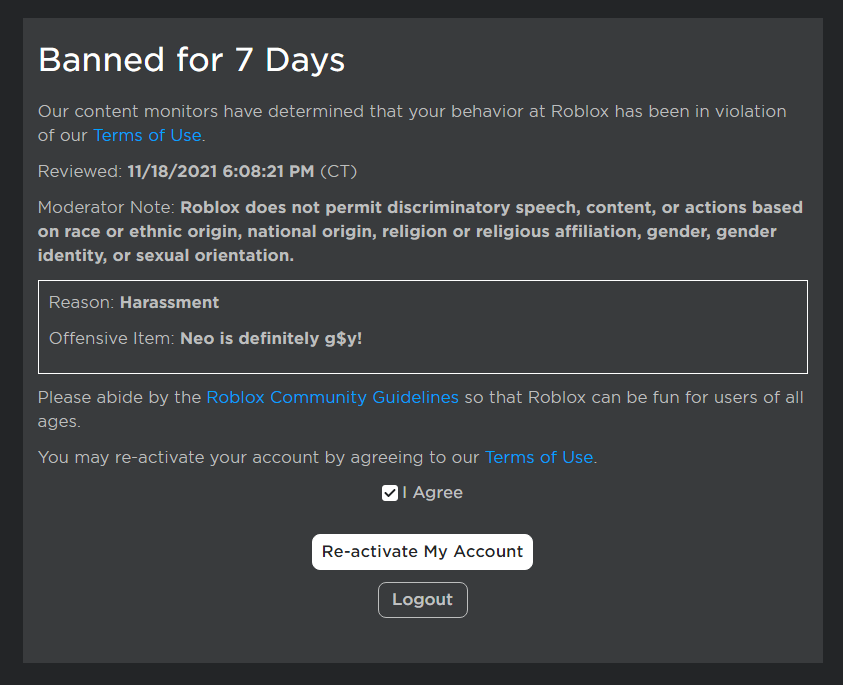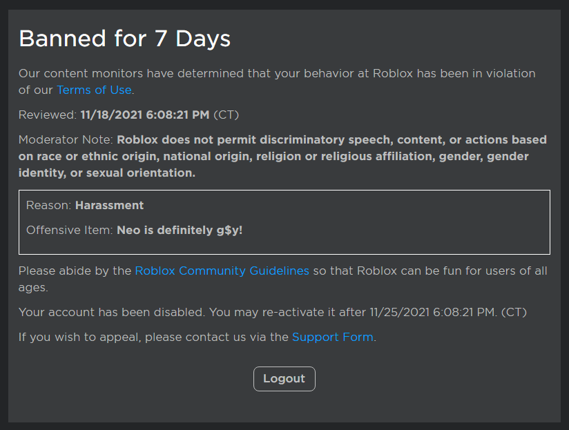 "Excuse me, what the [SICK!!]? I was tryin' roleplayin' in FNF Roblox. Bruh- I got banned for 7 days.. I guess, I'll have to wait for 7 days" >:/