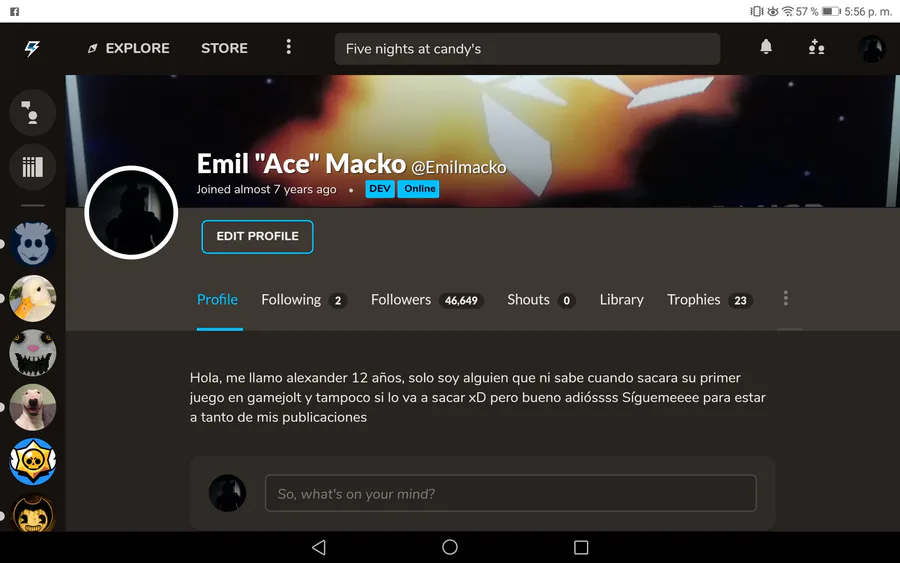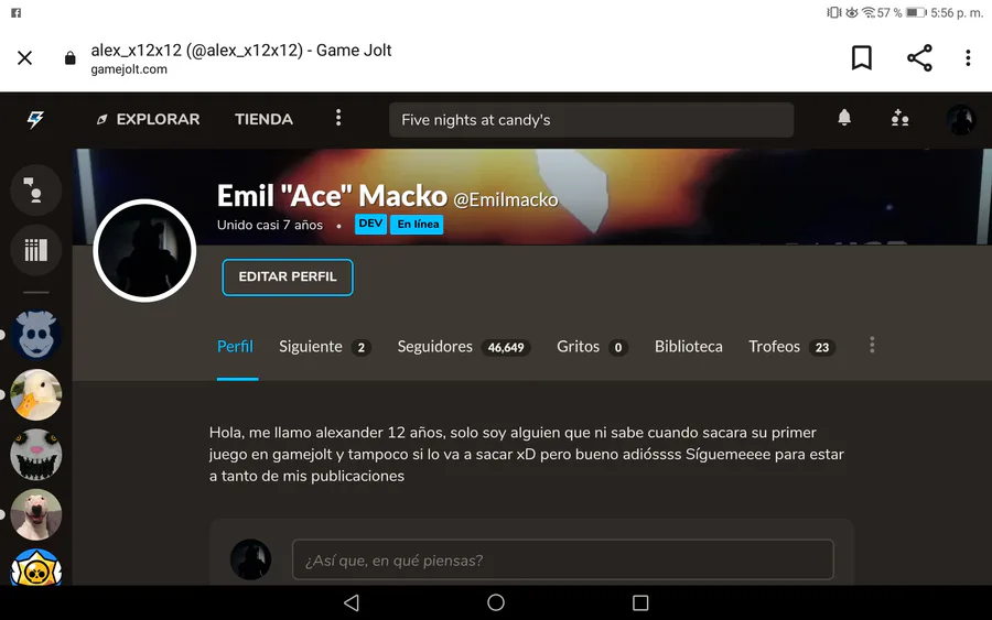 Hola, em... Lo que pasó es que... pues... No puedo ingresar a Game Jolt por la PC debido a que la página se queda en blanco, por eso la inactividad, pero no sé preocupen, seguiré haciendo dibujos y veré como publicarlos 😉