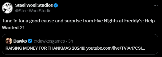 Steel Wool has tweeted that, for Dawko's Thankmas 2024 Charity stream, something related to Help Wanted 2 will be revealed!