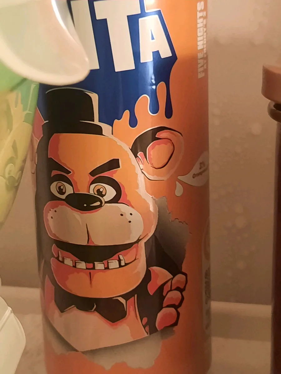 My Freddy Fanta just chilling in the fridge. (I SWEAR TO GOD THIS FANTA CAN IS JUST SO COOL- im gonna keep it.)
