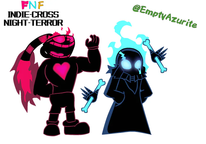 FNF Indie Cross Night-Terror Cuphead and Sans (Ink Demon isn't here because he is too big to be in the picture and I'm not finished drafting him) Cuphead Design based on his super arts II and III, Sans Design based on Gaster
