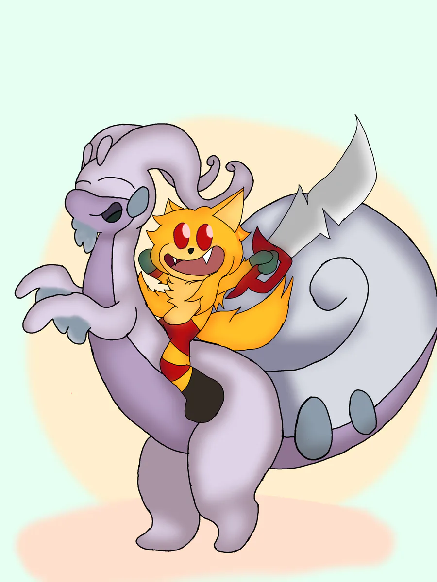 Have this draw of and antropomorphic yellow wolf with red stripes and a giant sword riding a Dragon/Dinosaur/Prehistorycal snail.