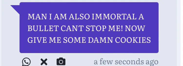 1: *evil demonic laughter* try all you want you still won’t be able to kill me
