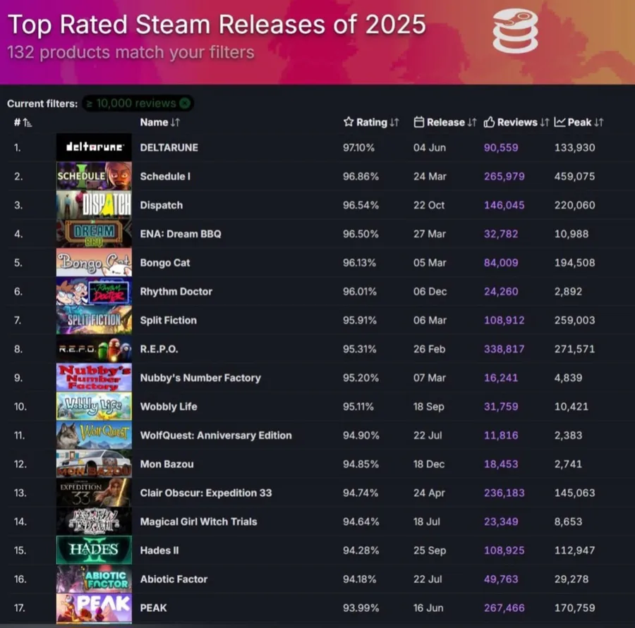 Here's a list of the top rated steam releases in 2025, DELTARUNE is the first one. 💪