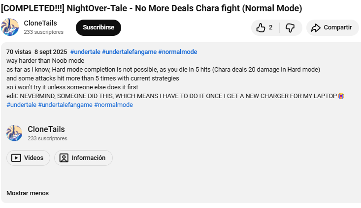 Ah yes, I still remember that time when I ended up proving you wrong about NightOver-Tale's No More Deals Chara Fight on Hard Mode being impossible. Good times, right?