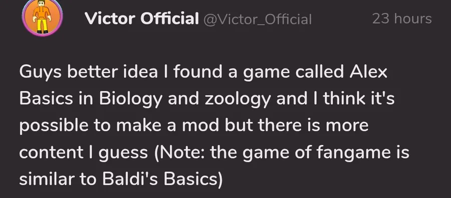 Guys better idea I found a game called Alex Basics in Biology and zoology and I think it's possible to make a mod but there is more content I guess (Note: the game of fangame is similar to Baldi's Basics)