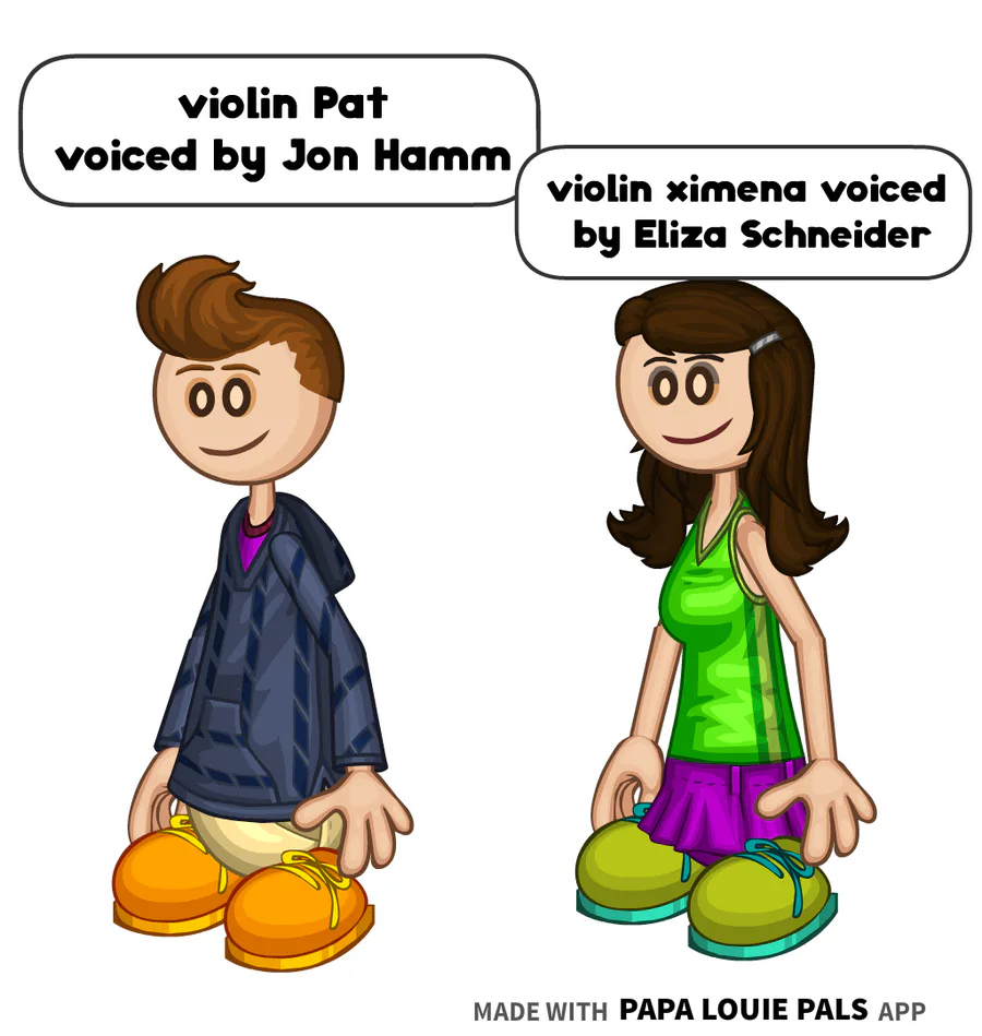 violin Pat is voiced by Jon Hamm violin ximena is voiced by Eliza Schneider from the coiny show