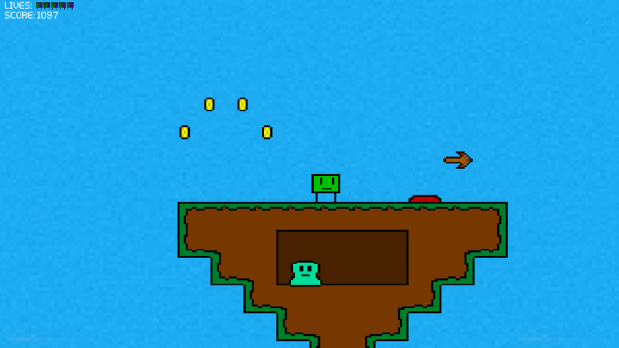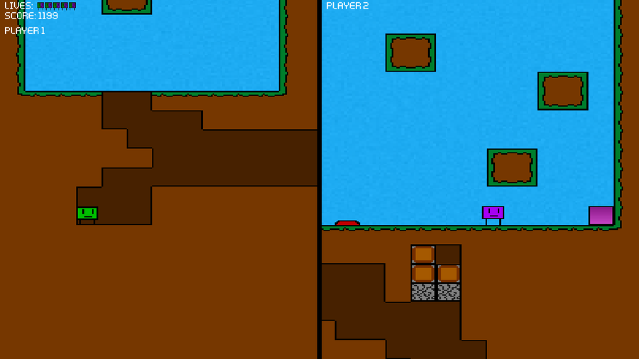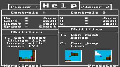 A little project I've been working on, it's been off and on work but I think it might just be ready to show. The game is very simple; it's a (somewhat sidescrolling) platformer. The game consists of two characters, green and purple, green can shoot, while purple can jump high. One player uses a keyboard while the other uses a basic Xbox 360 controller, or if you really want you can both use the keyboard. The goal of the game is simple, work together to solve basic puzzles and collect little boxes of your color to complete levels, easy enough. Right? There is also a dedicated singleplayer mode for if you don't have anyone. The singleplayer is also a very simple concept of where you switch from green and purple to solve simple enough puzzles. I hope you find this game somewhat interesting because there's still a lot more to come. #adventure #retro #strategy