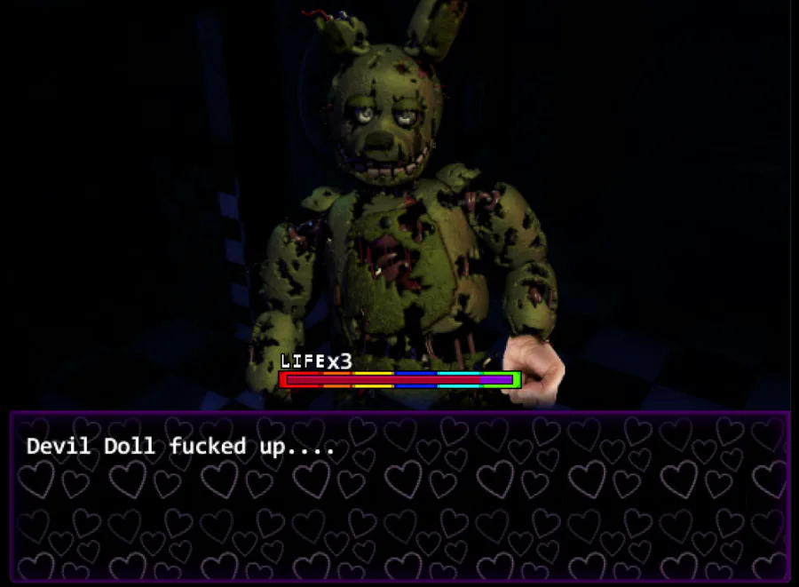 In this game you play as tails doll who wants to have a radical night of "debauchery" (despite not knowing what it means) but in order to do that he has to take down all of the dios in house to unlock the office and beat whatever is inside. With the help of Chungus Yoshi, Compa, Rat, and one more new party member, Kill those dios so you can have your amazing night.
