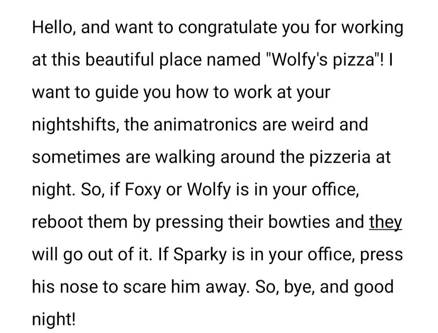 You are playing as Jack, nightshift guard at the pizzeria named "Wolfy's Pizza" it was open after "Fazbear Entertainment" has been sold to another person. They did huge re-branding, and now company name is "Wolfy's Entertainment". Some of the animatronics were replaced as well. Now main mascot of the pizzeria is Wolfy. He is replacement of Freddy. You are completing your first shift, but, when you are trying to open the Exit door, you understanding that it's locked... You should survive here for 4 nights, make choices and find any possible way out... Your destiny is in your hands... Don't get caught.
