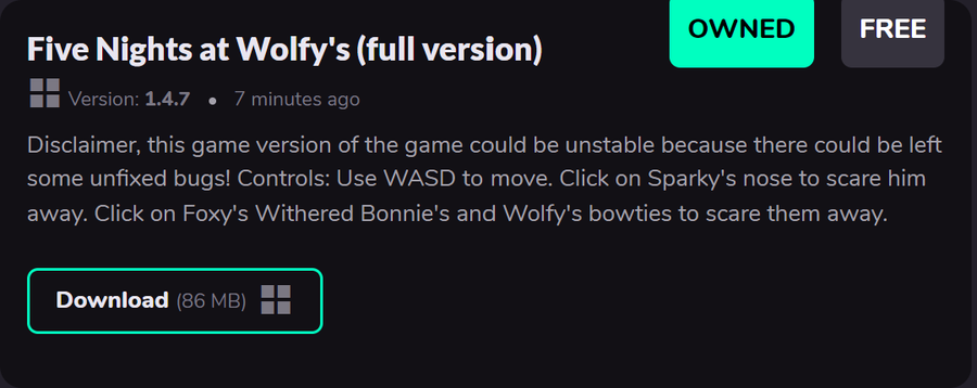 You are playing as Jack, nightshift guard at the pizzeria named "Wolfy's Pizza" it was open after "Fazbear Entertainment" has been sold to another person. They did huge re-branding, and now company name is "Wolfy's Entertainment". Some of the animatronics were replaced as well. Now main mascot of the pizzeria is Wolfy. He is replacement of Freddy. You are completing your first shift, but, when you are trying to open the Exit door, you understanding that it's locked... You should survive here for 4 nights, make choices and find any possible way out... Your destiny is in your hands... Don't get caught.