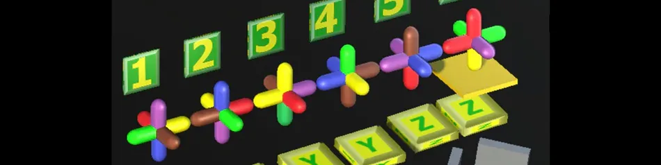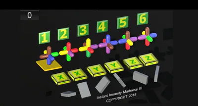 Six clusters in a row. Each cluster contains six objects. You can rotate clusters around the axes. Click on the cluster to choose it. Use XX, YY, ZZ buttons on the screen. You can swap clusters. Use 1,2,3,4,5,6 buttons on the screen. Task: All objects on the bottom row must have different colors. All objects on the top row must have different colors. All objects on the back row must have different colors. All objects on the front row must have different colors. All objects in the central row on the right sides of the clusters must have different colors. All objects in the central row on the left sides of the clusters must have different colors. All objects between clusters must have different colors. Solution = 12 moves. To hide rotating indicators = click on any indicator. To use rotating indicators = click on the black cube on the left side of the X button. #arcade #puzzle #other #action #retro
