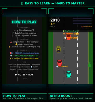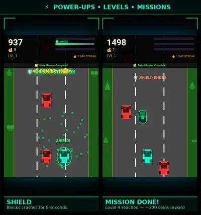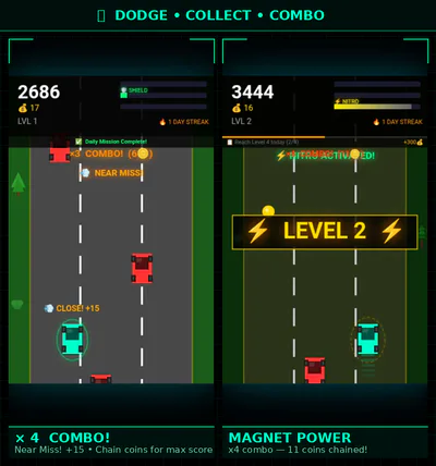 - 3 power-ups โ Magnet, Shield, Nitro (8s each)