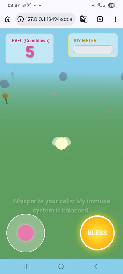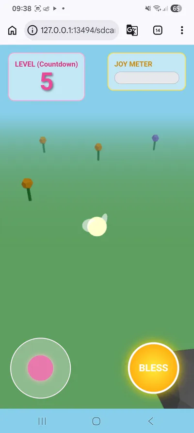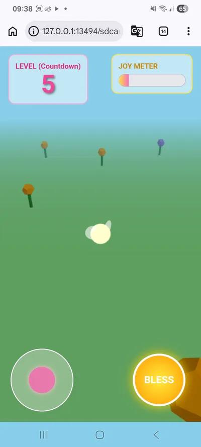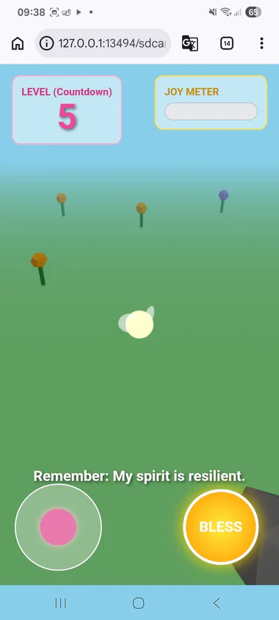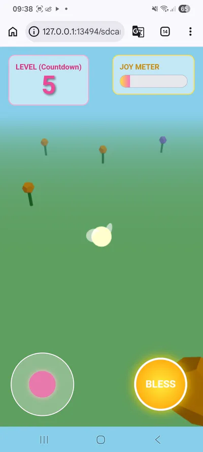 ​Gameplay Mechanics: Use a virtual joystick to navigate the garden, collecting floating pink heart-shaped "Joy Orbs" and using a "Bless" button to release waves of healing energy.