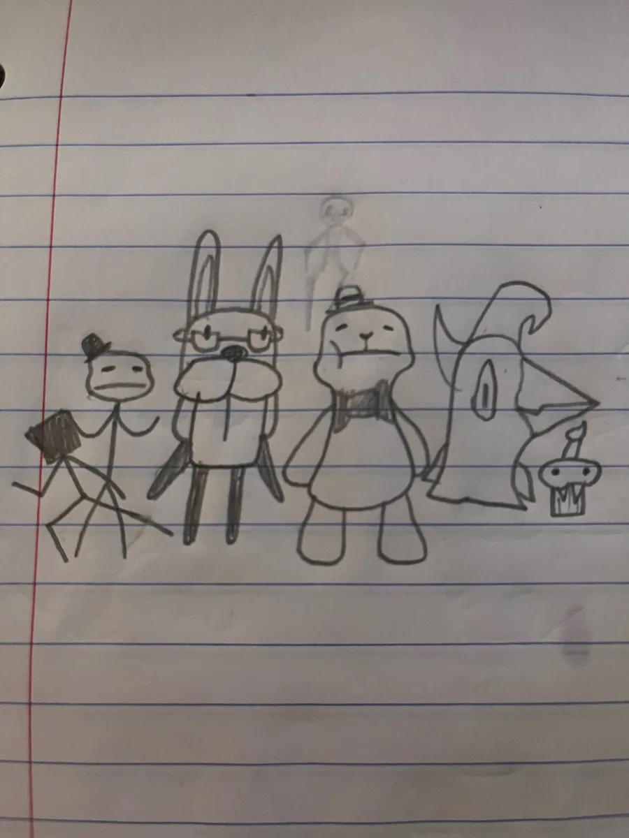 I don’t really know what to put here besides concept art I made so here’s the cast at the moment (designs may change and characters may be added in the future). By the way designs of Bonnie and Chica were made by @CactiGuy
