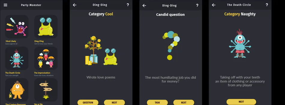 Did you get bored of endless Alias, Forfeits and Crocodile games during the party? Then Party Monster is what you need. It is an original collection of games with friends on the Android platform. The collection includes games on the alcoholic, active, intellectual and even vulgar themes. Some games are firstly released on Google Play and will fit at any party.