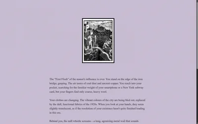 What begins as a quiet train ride into Greenwich Village quickly dissolves into a temporal nightmare. You are ripped from the streets of Manhattan and thrust into the soot-choked industrial hell of Salford, 1930. Standing between you and your reality is Lady E (Epsilon)—a towering entity in red leather boots whose Red Diamond earrings pulse with the frequency of a dying world.