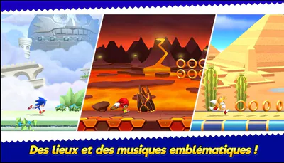 Gameplay Nerveux : Le personnage court automatiquement vers la droite. Vous devez sauter, esquiver des obstacles et attaquer des ennemis en touchant l'écran au bon moment pour maintenir votre vitesse et collecter des anneaux.