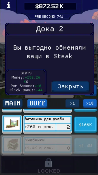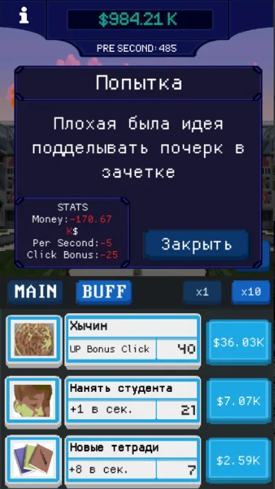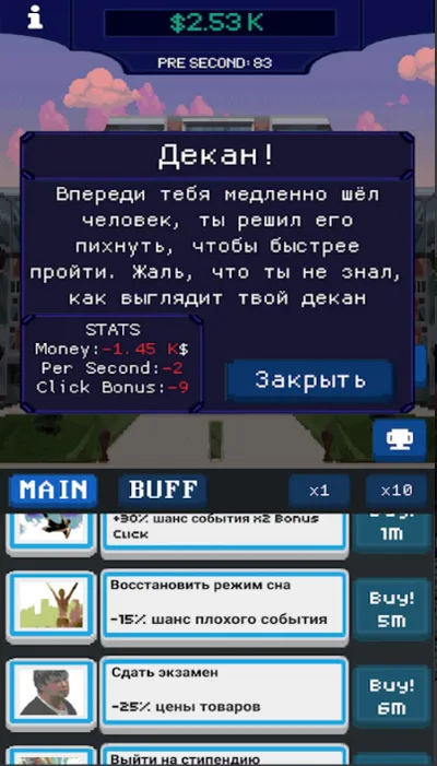 You are an ordinary student who wants to graduate from a university, but unfortunately, studying is not easy for you, but you can make money! Your goal is to bribe the rector, otherwise you will be expelled!