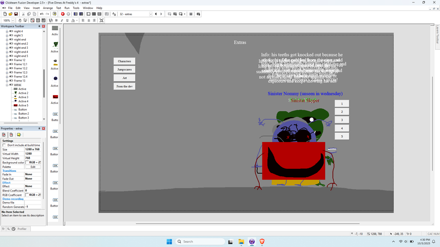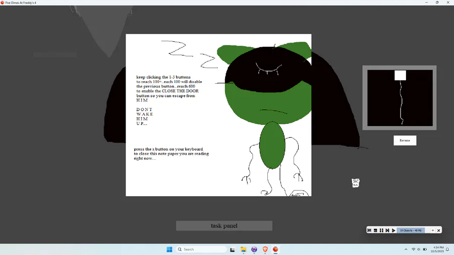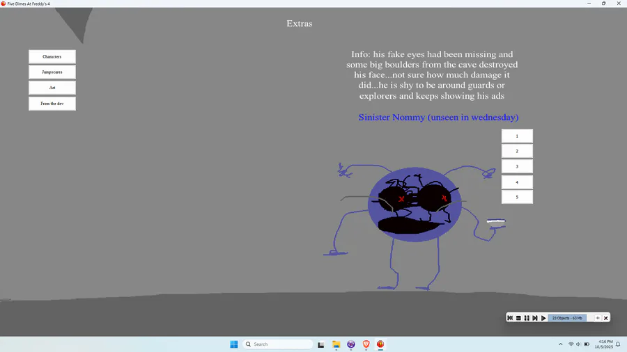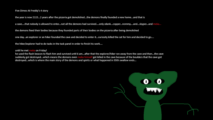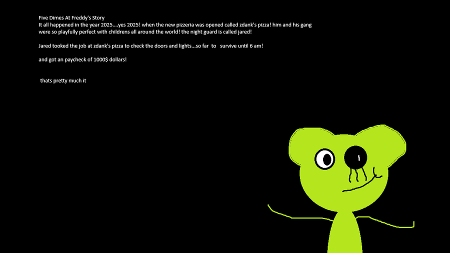 this game has nothing to do with the five dimes at freddy's story but i will do an the entire story of the game on the gamejolt page!