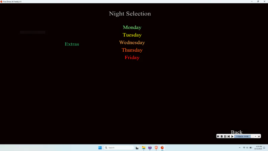 there is an bug in five dimes at freddy's 4 when you finish the cave entering scene in night 1 from the left the counter will continue to 20 as example when starting monday so you need to close the game and run it back on to fix it