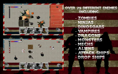 Four immensely patriotic, American soldiers have mysteriously awoken on an island. Having to face off against waves and waves of calamities including Zombies, Ninjas, Dinosaurs, Vampires, Dragons, Monsters, Aliens, Mech Warriors (Killer robots), space ships, alien ships, and drop ships, the soldiers must fight through, day and night, in order to survive. Inspired by the old AVP (Alien vs Predator movies), our heroes quickly find they are either being hunted for sport or being tested for weaknesses, like some sort of lab experiment. Survival against everything the enemy has will prove that America cannot be conquered and a future invasion would be futile. Defeat would signify that America might have some sort of weakness that the enemy could exploit. Little does the enemy know, America has no weakness! Defend your base (Tower defense)! Join the fight, show them that the USA will not be defeated. Show them what freedom and liberty is all about! The world is depending on you, make your country proud!