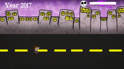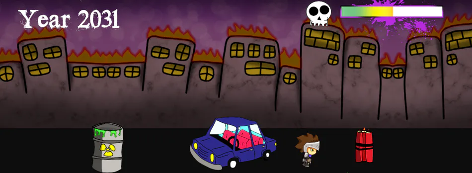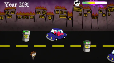 This is an endless race where you have to go as far as you can. If you touch an obstacle (cars, dynamites, barrels), the apocalypse bar will increase and if you collect heal bags, it will decrease, but you can't go below a step, one color in the bar being equal to one step (the city will shake when you reach a step). When the apocalypse bar is full, this is the total apocalypse in the world and the game ends.