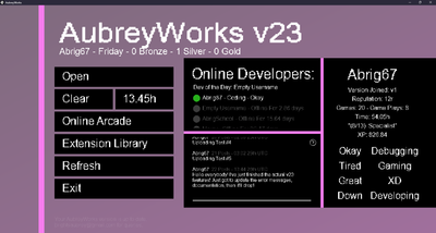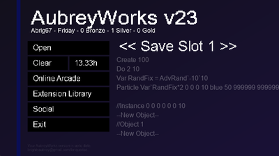Welcome to AubreyWorks! AubreyWorks is a newly built game-engine that offers developers tools to create and share video games. The primary objective of AubreyWorks is to provide a beginner-friendly introduction to game-development. AubreyWorks prides itself in its accessibility, which is accomplished by its forgiving beginner-friendly functions and the software's ease of use. Games build instantly, the software can be downloaded in seconds, and save files can be dragged and dropped into any platform. AubreyWorks is big on practical learning, so rather than following written or video tutorials (which do exist), beginners are encouraged to study the code of games published to the platform. A core aspect of AubreyWorks is the community it is driven by, so you can expect frequent community building events and to make some friends. Express yourself in code, in art, or by supporting AubreyWorks' ongoing development. AubreyWorks' extensive documentation can support the beginners journey past the initial learning curve, with a comprehensive list of functions, guides, debugging guides, crucial information, and extras. AubreyWorks games are in-platform and cannot be exported to .zip files without an accompanying code interpreter (bundling the software), to ensure simplicity and community. Learn coding fundamentals, make games, or help shape the future of AubreyWorks.