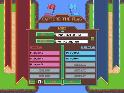 To host the game, one player needs to act as the server and run CTF Server.exe. Note that even if a player is hosting a game they can open up a CTF Client.exe program and connect to himself to play. Once the program opens, the host needs to designate a port to use. This can be any value, but the default is set to 8080 and i recommend you use that. After selecting a port the host needs to click the Host Game button to begin hosting a game. At the top of the server lobby screen there will be two IP Addresses printed out: the local address, and the public IP address. Players connecting to the server from the same internet connection should use the local ip address to connect, and players connecting from a different internet connection should use the public ip address. To connect with players via a public ip address the host must have forwarded the port they are using to host (the number you entered in the very first screen). Once all players are connected the host can set the score requried for a team to win the match (bottom left corner of the screen), and then hit the Start button to start the game. You cannot start a game unless there is atleast one player on each team.