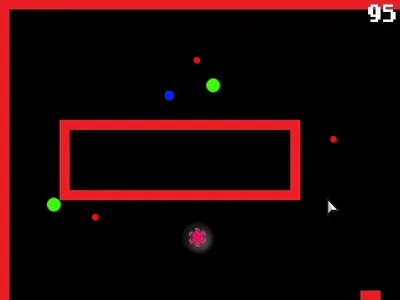 Avoid collising with green balls, red balls and red moving squares.