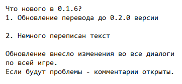 В переводе присутствуют: Баги(текст может выходить за рамки, а также могут пропадать спрайты), Неграмотность (Ошибки в словах), почти нету букв "ё", "й".