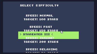 EAT THE STAR! - A simple arcade game where your task is to eat stars by pointing your mouth in their direction! This game was created out of my love for art, unusualness, and... Obsession? 4 difficulty levels, anti-cheat system (I want everyone to be equal), minimalism, Monica and the Green Whale! I'd appreciate any feedback. Good luck!