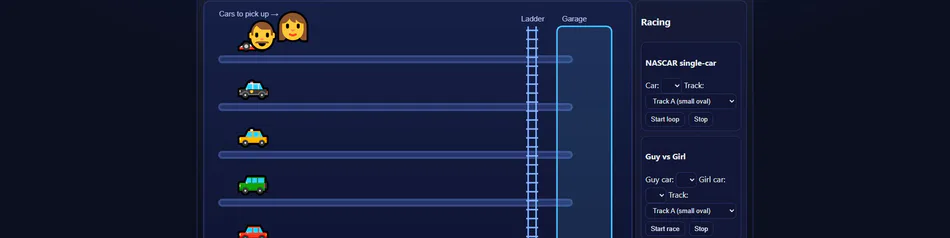 drive your rich guy cars to your Gurage adjust the speed watch them go around the infinity figure 8 race the guy and girl pick your car random winner nascar single car mode