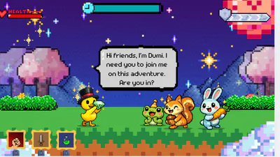 Quacky Adventures Gem Quest is a 2D survival sandbox where you take control of a duck exploring an infinite procedurally generated world. The game combines classic platforming mechanics with deep crafting and building systems, allowing you to manipulate every block in the environment. As you navigate through different biomes like forests and deep cave systems, you will need to manage your hunger and health while gathering essential resources. The underground is rich with coal, iron, and rare diamonds, but you must stay alert as zombies and other threats emerge in the shadows. You can break any part of the terrain with a left click to collect materials and use a right click to place blocks and build your own structures. The inventory system is intuitive, using numerical keys for quick access to your tools and gathered items. Whether you are focused on building a massive base or diving into the deepest pits to find legendary gems, the game offers a fluid and responsive experience designed for fans of retro pixel art and open world exploration. Use the A and D keys to move, Space to jump, and the mouse to interact with the world around you. This project focuses on providing a professional and optimized sandbox experience directly in your browser.