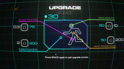 The longer you survive, drones get stronger, and you wouldn't just roll over and die. As you destroy drones, you collect orbs, which can be used to upgrade your max health, overheat threshold, firepower, and more, evolving as the drones evolve.