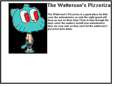 The Watterson's Pizzeria is a good place for kids seen the animatronics so cute the night guard will keep a eye on them from 12am - 6am through the days since the workers install the new animatronics they are very cute so they can't let the The Watterson's pizzeria burn down.