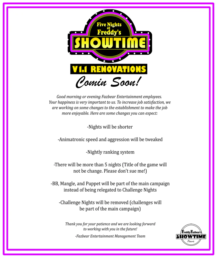 Welcome to Freddy Fazbear's Showtime Pizzeria! A place for kids and grownups alike, where fantasy and fun come to life. When you're not getting food poisoned from our half-prepared pizza or losing an entire paycheck from the arcade games, you're probably watching our state-of-the-art animatronic band perform on stage. Although watching them during the day is a treat, you won't be watching them during the day...