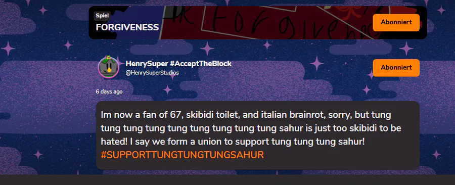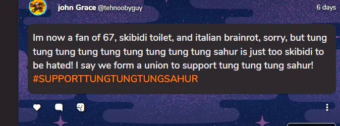 Im now a fan of 67, skibidi toilet, and italian brainrot, sorry, but tung tung tung tung tung tung tung tung tung sahur is just too skibidi to be hated! I say we form a union to support tung tung tung sahur! #SUPPORTTUNGTUNGTUNGSAHUR
