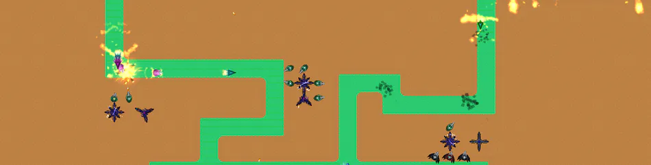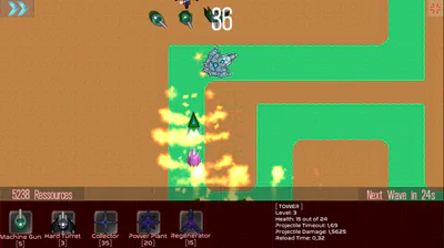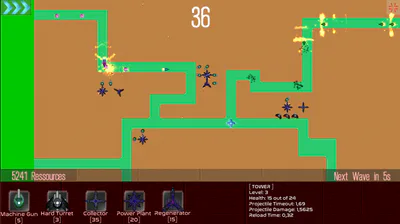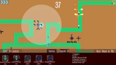 A Turret needs to be as close to a Powerplant as possible, or it's efficiency will decline even down to zero. Towers can be destroyed by certain enemies. That's why it's important to have a Regenerator nearby. Lastly, having a Collector is key: It collects all ressources dropped by enemies in a certain radius that can be used to build new Towers.