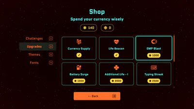 Unlock the EMP Blast to push back enemies, giving you a breather while the pressure mounts. Build up your Typing Streak to enable your EMP to recharge quickly. Collect Coins and Gems to unlock more challenge tiers, increase your lives, enable powerups, buy upgrades and customize your experience.