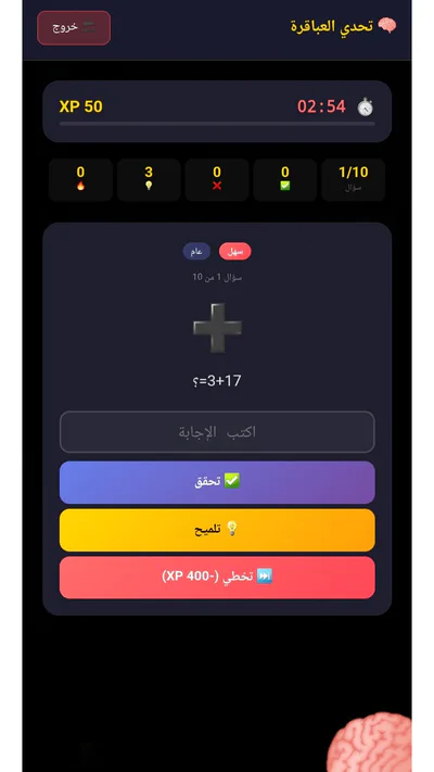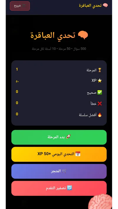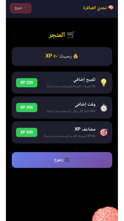 🧠 تحدي العباقرة: أسئلة ذكاء يومية وجوائز XP لمن يحلها داخل اللعبة.