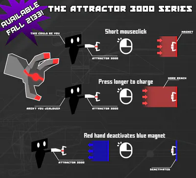 In Magnesia, the character you play can use his hands to make a magnet positive or negative. He can do this by shooting his hands towards the magnet he wants to change. This way the magnet can attract or repel certain objects. This mechanism has to be used in a particular way so that the player can advance in the game.