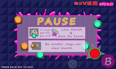 Mover must move throughout the maze killing slugs, to gain points, in order to move to the next level, before time runs out! Be careful, slugs can steal you're health, and they can die on shock platforms and spinning spikes. This can reduce you're health, and give you no score. Good Luck!