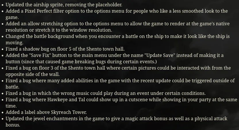 If running the game off an old save file, select the "Update Save" option in the main menu to update your save file to match the current version of the game. Your save files (if you want to keep them) are located in the save folder of Necra, which is in the www folder for most versions of the game. I can NOT promise save files will work from version to version. It all depends on what is changed during development. Game stability with old saves is not guaranteed, but most save files at this point are safe or can be updated to the current version.