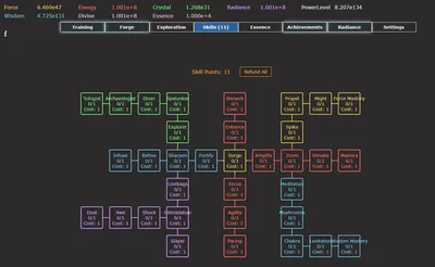 Essence: Through rebirth, you gain essence, which can be used to unlock permanent upgrades that boost your training and exploration efforts.