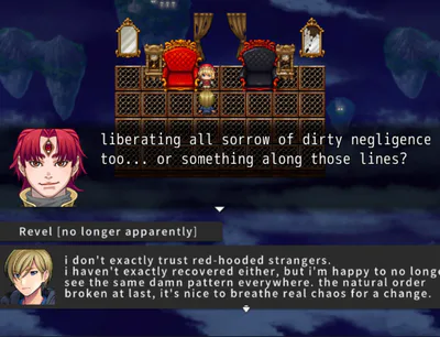 hell, you gotta consider yourself lucky to have run into a conveniently formed group of Nonsequitourists, featuring the mad royalty Xortau, his deranged peer yet highschool teach Carmo Karmo, and intruder from beyond Anton R. Clement - a Dreamer too Sporadical - among more familiar faces not yet aware of their own familiarities.
