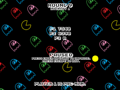 Pac-Man Battle is a game where the player with the most points wins after fifteen rounds of classic Pac-Man fun is over! This is my first 100% completed game, so if i need to change anything or you just have advice, please tell me!